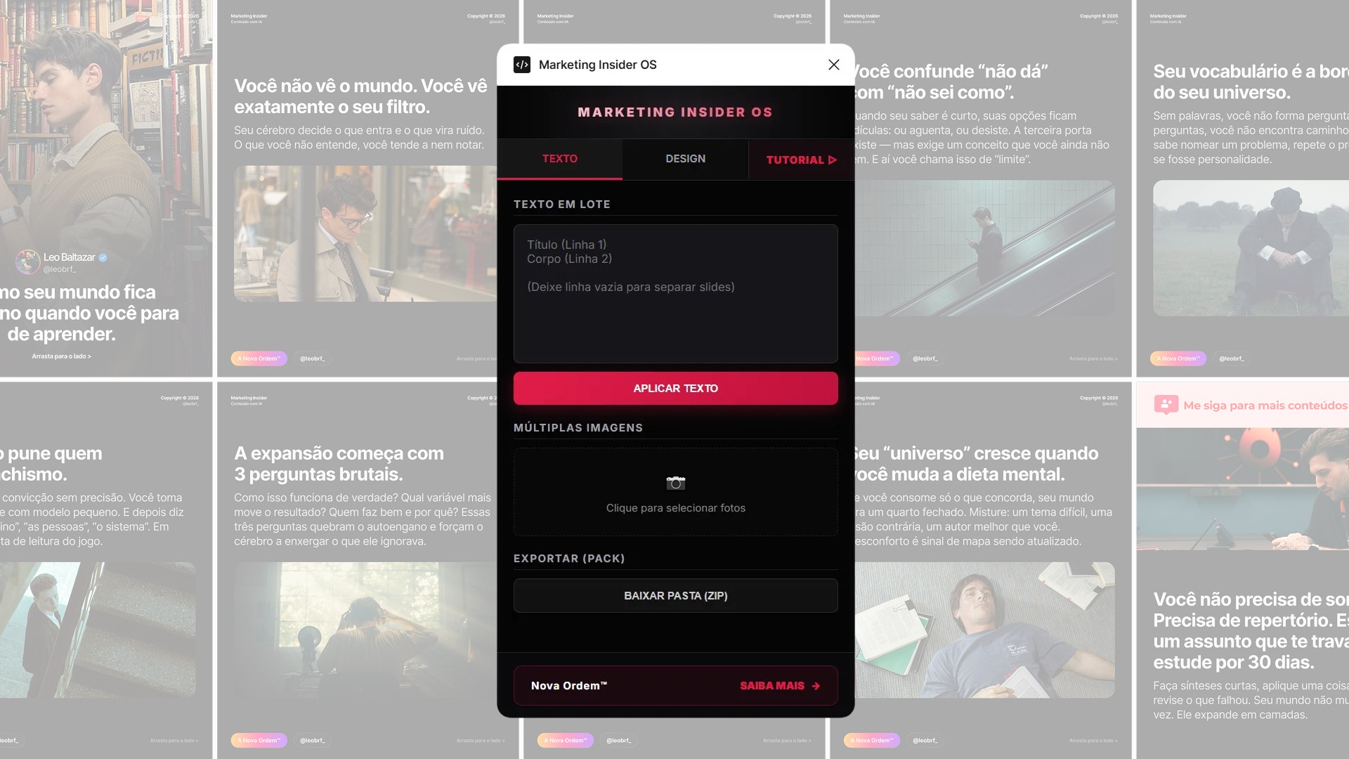 Transforme suas ideias em visuais épicos. Nosso agente combina direção de arte, enquadramento cinematográfico e estilos realistas para gerar imagens que parecem saídas de um estúdio de Hollywood. Em poucos cliques, você tem imagens prontas para elevar seus carrosséis a outro nível - únicos, impactantes e impossíveis de ignorar.